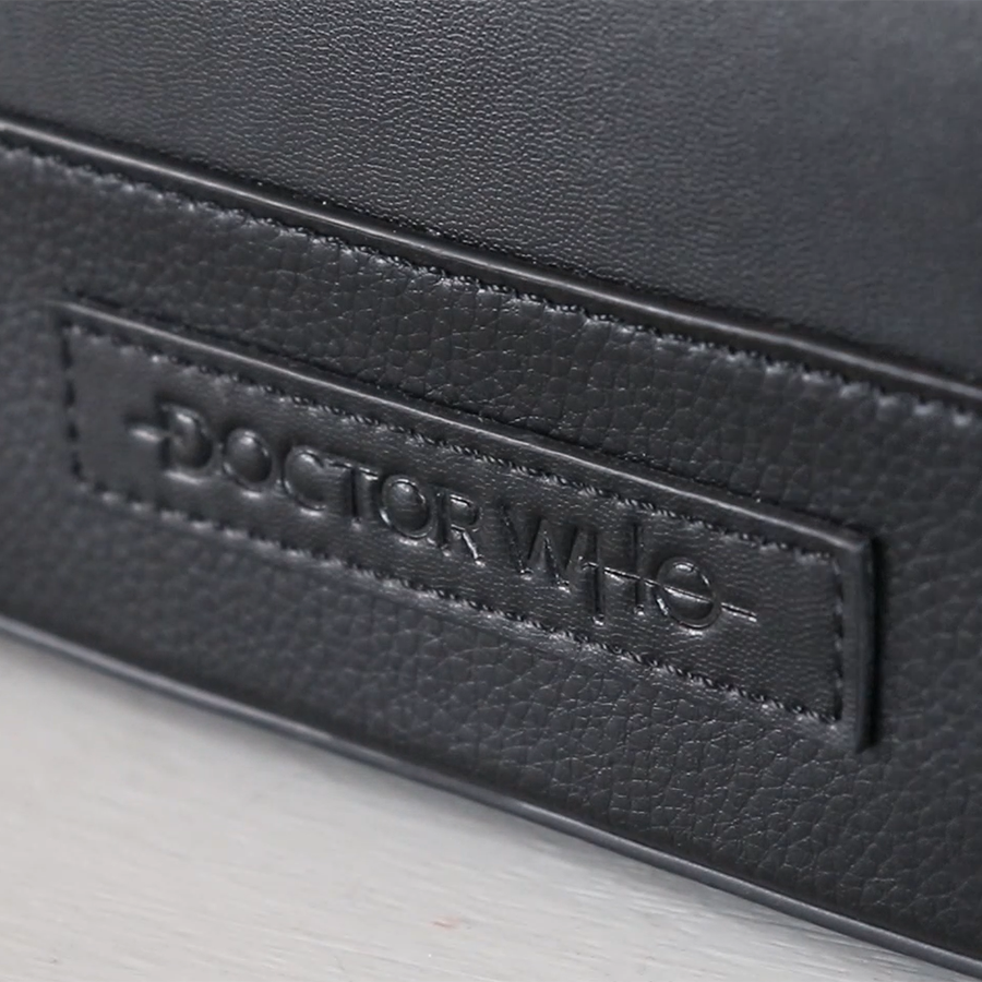 Sleek and professional… but with a difference! You can personalise your bag using exclusively designed pins. It comes with 7 pins: the TARDIS; K9; the Seal of Rassilon; a Cyberman head; a Weeping Angel; bow tie; and, printed in full colour, the Thirteenth Doctor's silhouette against a sunset, while, in the backdrop, the TARDIS waits to whisk her off across the universe.
