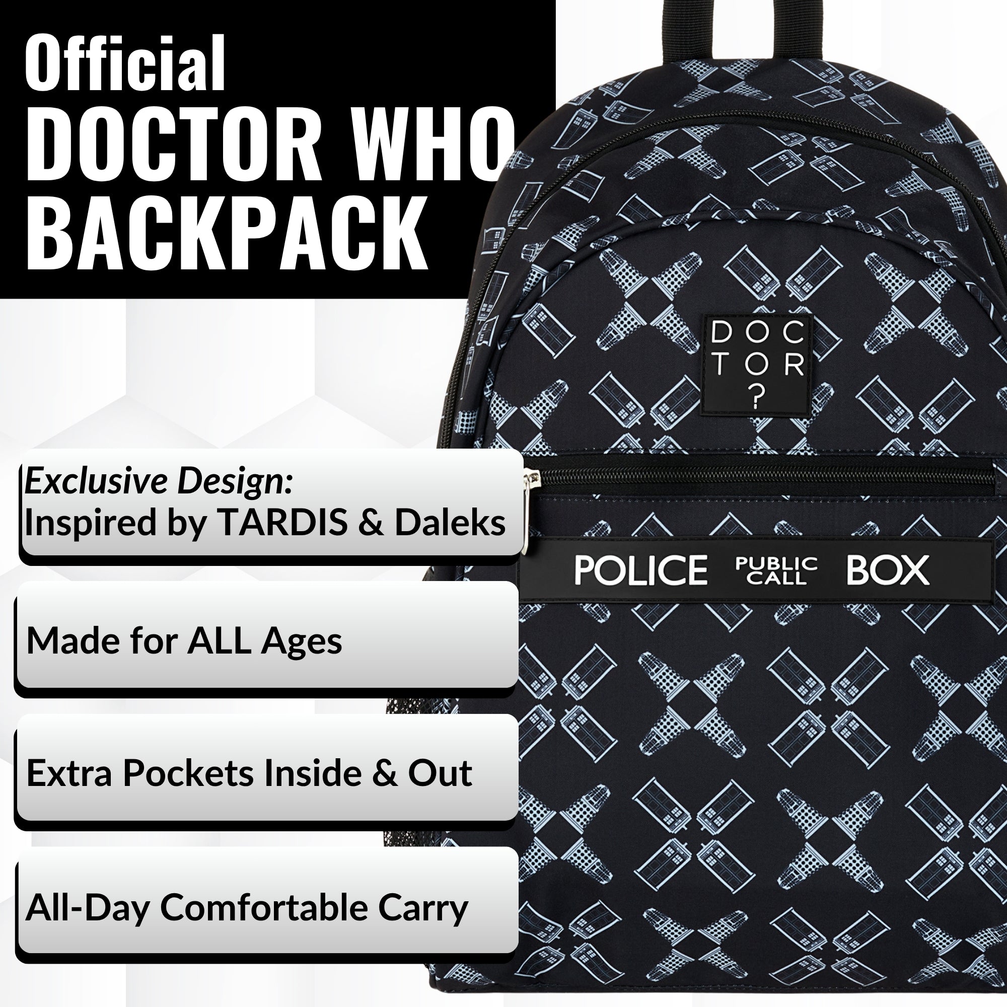 If you ever find yourself inside the actual TARDIS, our backpack is designed to automatically turn bigger on the inside. Until then, we think the spacious main section, additional front pocket, and padded laptop compartment inside (designed to fit devices measuring up to 15.6”) will give you more than enough room to carry your day-to-day goodies about with you.